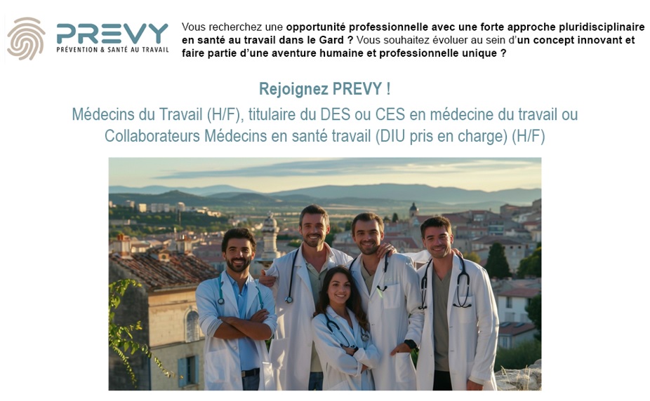 Vous recherchez une opportunité professionnelle avec une forte approche pluridisciplinaire en santé au travail dans le Gard ? Vous souhaitez évoluer au sein d’un concept innovant et faire partie d’une aventure humaine et professionnelle unique ? Rejoignez PREVY !