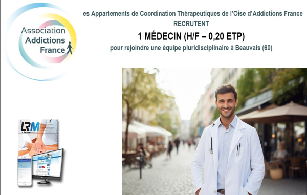 Les appartements thérapeutiques de l’Oise d’Addictions France recrutent un médecin pour rejoindre une équipe pluridisciplinaire à Beauvais (60). En lien avec le projet de soin élaboré en équipe, le-la médecin sera amené-e à recevoir et accompagner des personnes vivant une prise en charge en hébergement diffus dans le cadre de leur coordination médicale.