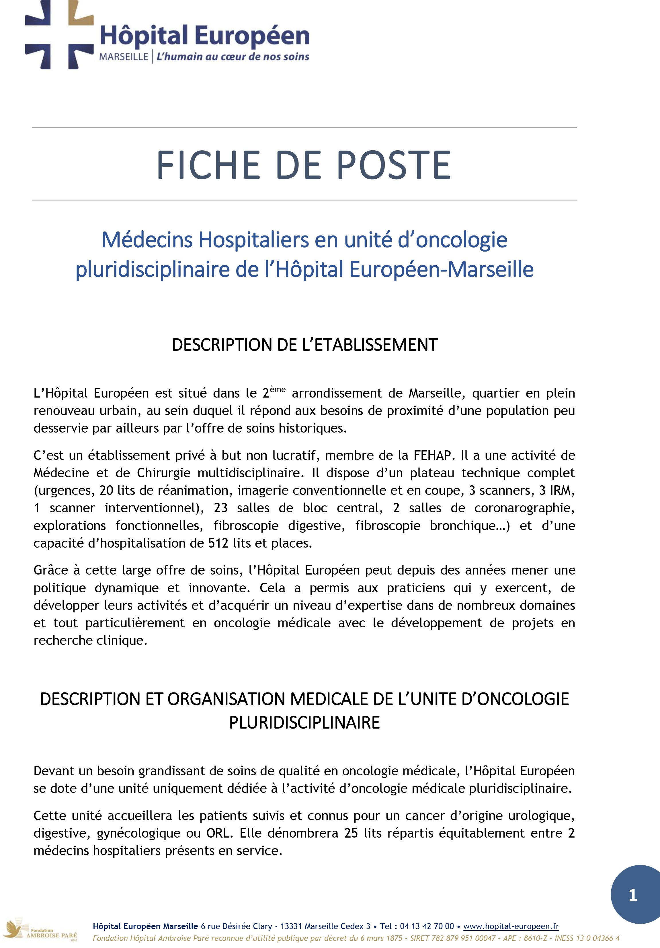 Médecins Hospitaliers en unité d’oncologie pluridisciplinaire de l’Hôpital Européen-Marseille