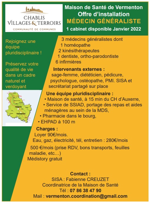 LA MAISON DE SANTE DE VERMENTON Offre d’installation MEDECIN GENERALISTE H/F 1 cabinet disponible Janvier 2022 Rejoignez une équipe pluridisciplinaire ! L’équipe actuelle : -3 médecins généralistes dont -1 homéopathe -2 kinésithérapeutes -1 dentiste, ortho-parodontiste -6 infirmières Intervenants externes : sage-femme, diététicien, pédicure, psychologue, ostéopathe, PMI. SISA et secrétariat partagé sur place Une équipe pluridisciplinaire : • Maison de santé, à 15 min du CH d’Auxerre, • Service de SSIAD, portage des repas et aides ménagères au sein de la MDS, • Pharmacie dans le bourg, • EHPAD à 100 m Charges : Loyer 90€/mois. Eau, gaz, électricité, tél, entretien : 280€/mois 500 €/mois (prise RDV, bons transports, feuilles maladie, etc…) Médistory gratuit Possibilités de travail en équipe de 4 à 5 généralistes sur un périmètre de 20 km et sur plusieurs pôles de santé. Une installation clé en main Zone ZRR Exonération d’impôt sur le revenu • 100% pendant 5 ans • 75 % la 6e année • 50 % la 7e année • 25 % la 8e année. Aide forfaitaire de 50 000€ versée en 2 fois Département Yonne: aide à l’installation 15 000€ Complément de rémunération si celle ci est inférieure à 6 900€ par médecin Mise à disposition gratuite F3 (durée à définir) Répondez aux besoins de la population : Vermenton 1350 habitants,15min d'Auxerre, 1h30 de Dijon, 2h de Paris. Péage A6 à 10 km Un bourg attrayant et connecté dans un département en expansion (+ 7,3% aux derniers chiffres de l’INSEE) • À Vermenton : - Crèche, maternelle, école, collège, centre de loisirs, école de musique, associations culturelles et sportives, chemins de randonnées, etc… - Port de plaisance sur le Canal du Nivernais, baignade aménagée en bord de Cure - Marché, tous commerces, supermarché (station-service), banques, assurances, gare, borne recharge électrique, aire co-voiturage, etc… • À Auxerre (15 min) : lycées, antenne de l’Université, cinéma, théâtre, salles de spectacles, conservatoire école des beaux arts, piscine. • Aux alentours : cadre agréable de la vallée de la Cure : à 2 pas des grottes d'Arcy, de Vézelay, du Vignoble Chablisien et du parc naturel régional du Morvan. MEDECIN GENERALISTE Contact : SISA : Fabienne CREUZET Coordinatrice de la Maison de Santé Tél : 07 86 38 47 90 Mail : vermenton.coordination@gmail.com |