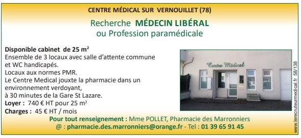 CENTRE MÉDICAL SUR VERNOUILLET (78) Recherche MÉDECIN LIBERAL ou Profession paramédicale Disponible cabinet de 25 m2 Ensemble de 3 locaux avec salle d’attente commune et WC handicapés. Locaux aux normes PMR. Le Centre Medical jouxte la pharmacie dans un environnement verdoyant, à 30 minutes de la Gare St Lazare. Loyer : 740 € HT pour 25 m2 Charges : 45 € HT / mois MEDECIN Pour tout renseignement : Mme POLLET, Pharmacie des Marronniers @ : pharmacie.des.marronniers@orange.fr - Tel : 01 39 65 91 45