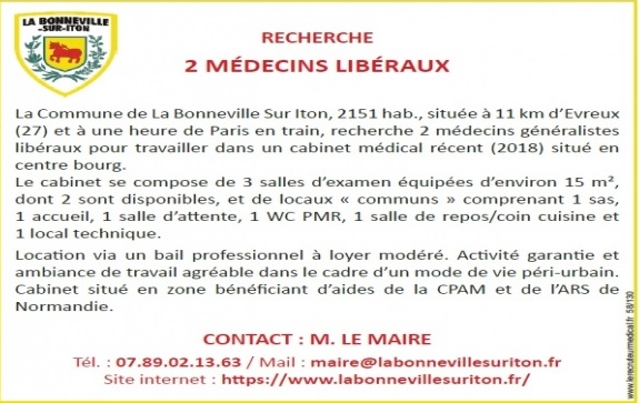 La Commune de La Bonneville Sur Iton, 2151 habitants, située dans l’Eure à 11 km au sud-ouest d’Evreux et à un peu plus d’une heure de Paris en train, recherche DEUX MEDECINS GENERALISTES LIBERAUX pour travailler dans un cabinet médical récent (2018) situé en rez-de-chaussée d’un immeuble jouxtant la Pharmacie, en centre bourg, à proximité immédiate de la Mairie et d’un parking public de stationnement. Le cabinet se compose de 3 salles d’examen d’environ 15 m² équipées, dont 2 sont disponibles, et de locaux « communs » comprenant 1 sas, 1 accueil, 1 salle d’attente, 1 WC PMR, 1 salle de repos/coin cuisine et 1 local technique. La location s’effectue via un bail professionnel à loyer modéré. Activité garantie et ambiance de travail agréable dans le cadre d’un mode de vie péri-urbain. Aucun droit d’entrée n’est demandé. Le cabinet est situé en zone bénéficiant de l'aide à l'installation de la CPAM et d’autres aides mises en place notamment par l’ARS de Normandie. Construction dans les prochains mois d’un cabinet de kinésithérapie et d’un cabinet d’infirmières intégrant également un pédicure. MEDECIN GENERALISTE Activité libérale CONTACT Monsieur le Maire Mairie - Rue Jean Maréchal - 27190 LA BONNEVILLE SUR ITON Tél. : 07.89.02.13.63 / Mail : maire@labonnevillesuriton.fr Site internet : https://www.labonnevillesuriton.fr/