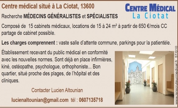 Centre médical situé à La Ciotat, 13600 Recherche MÉDECINS GÉNÉRALISTES et SPÉCIALISTES Composé de 15 cabinets médicaux, locations de 15 à 24 m² à partir de 600 €/mois – partage de cabinet possible. Les charges comprennent : vaste salle d’attente commune, parkings pour la patientèle. Établissement recevant du public médical en conformité avec les nouvelles normes. Sont déjà en place infirmières, kiné, ostéopathe, psychologue, orthophoniste... Bon quartier, situé proche des plages, de l’hôpital et des cliniques. Contacter Lucien Altounian lucienaltounian@gmail.com tél : 0607135718